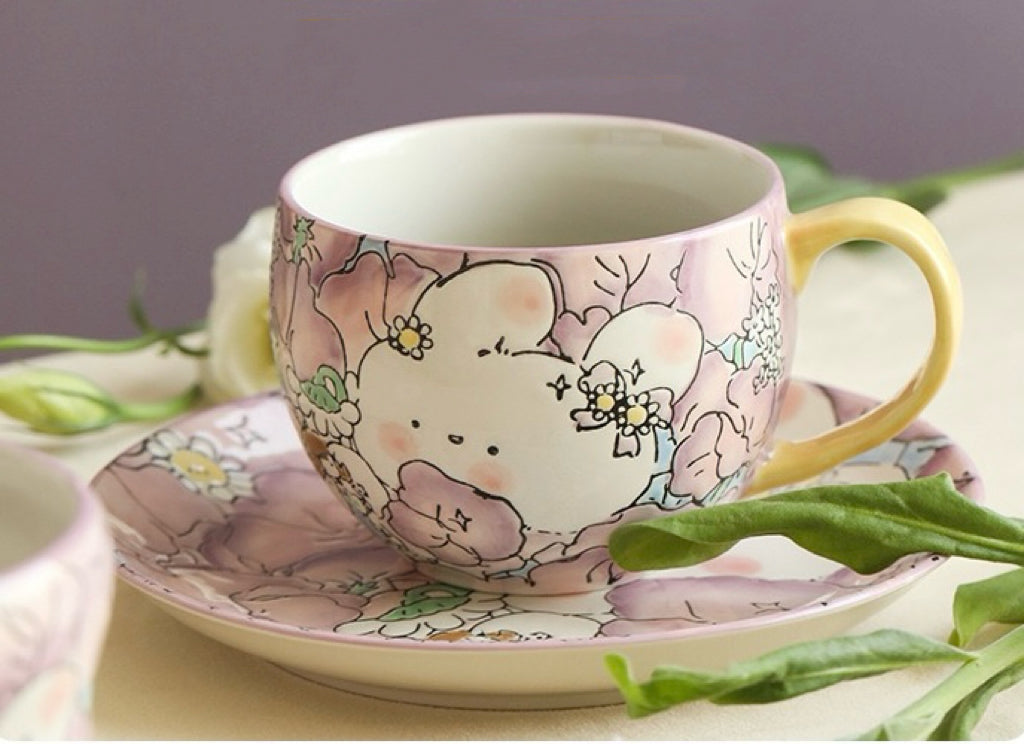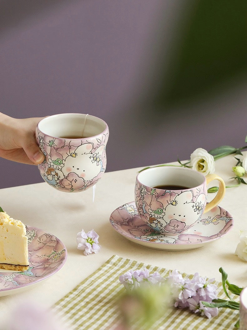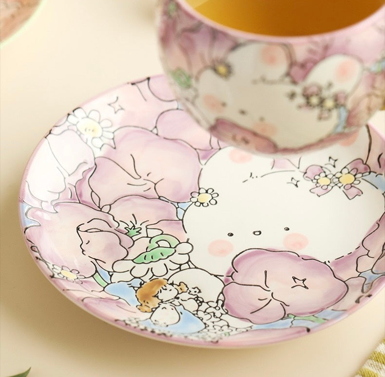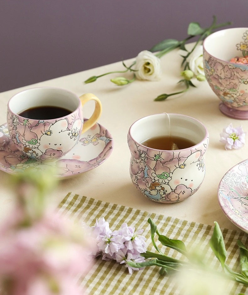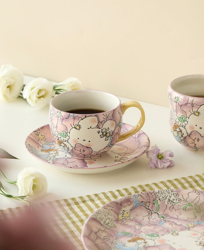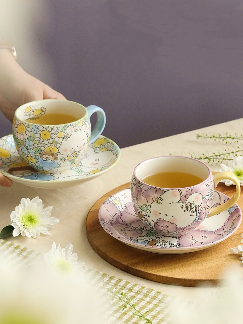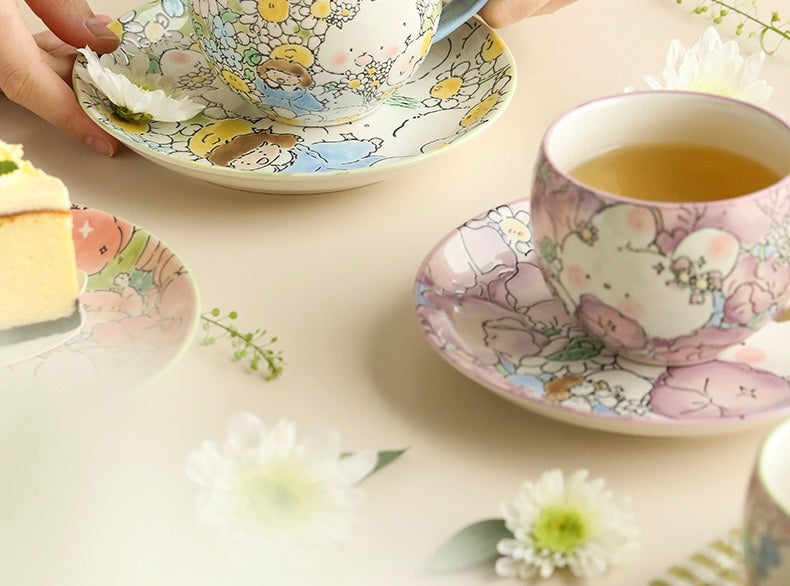 Introducing the 'Alice's Sweet Pea Flower Cup and Saucer' – illustrated with Alice and her dear friend, the White Rabbit, wandering through a garden of sweet pea flower. Sweet pea flower symbolizes gentle, happiness, pure, blessing, joyful, and serene.
