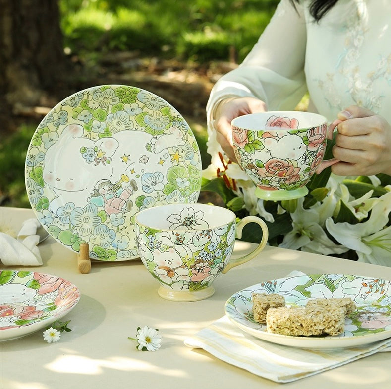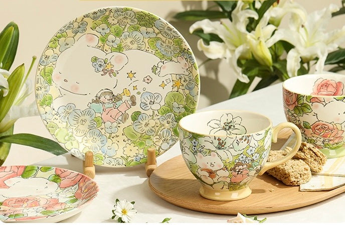 Introducing the 'Alice's Veronica Plate' – illustrated by Alice and her dear friend, the White Rabbit, wandering through a garden of veronica. Veronica symbolizes health, hope, and love.